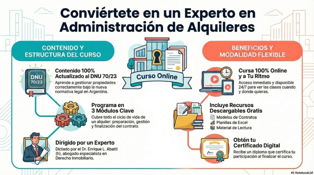 La administración de alquileres ya no es solo una tarea más. Con los recientes cambios legales en Argentina, gestionar propiedades correctamente no es opcional, ¡es imprescindible! Este curso te proporciona las herramientas para convertirte en un profesional indispensable en el mercado.
